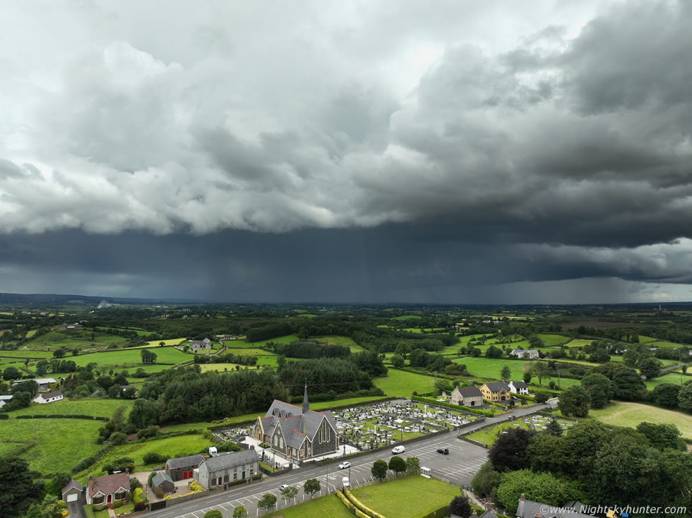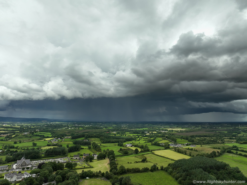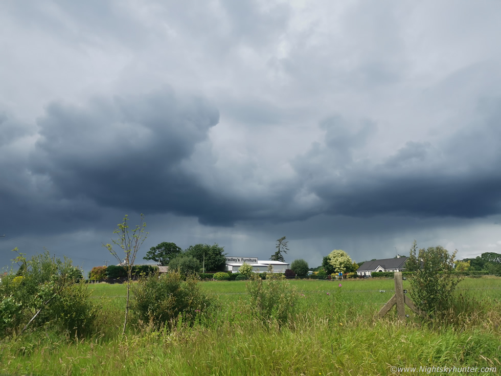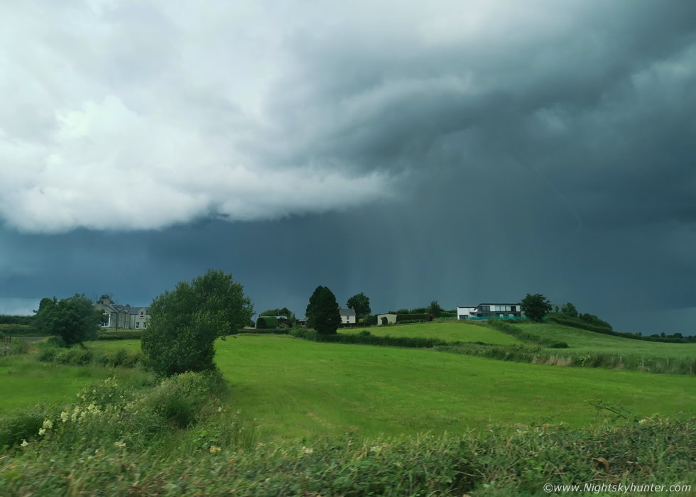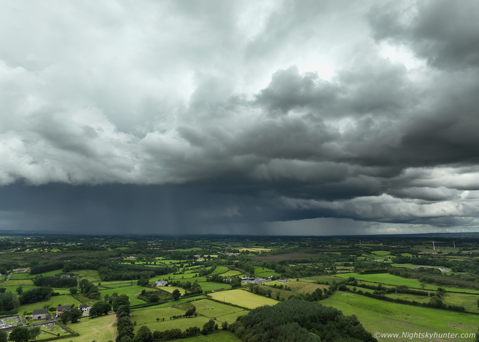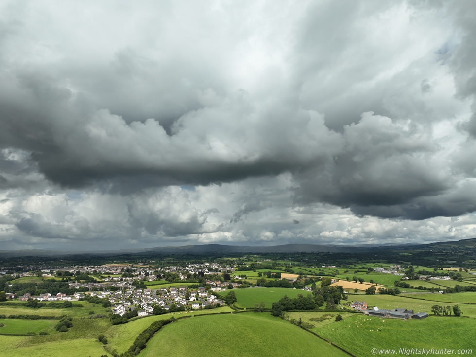 Drone up outside Moneymore looking W with part of Slieve Gallion on the right. That was the remains of the storm, it had stopped producing thunder and I had never heard any previous to this but knowing it had been a recent storm added to the excitement. As it approached it began to produce precip again and eventually started to form a weak gust front over the town with strengthening precip curtains, it looked like another storm brewing but it struggled to rumble. The clock was ticking and we were a little behind on getting to our target area so we wasted no more time with it and drove E.