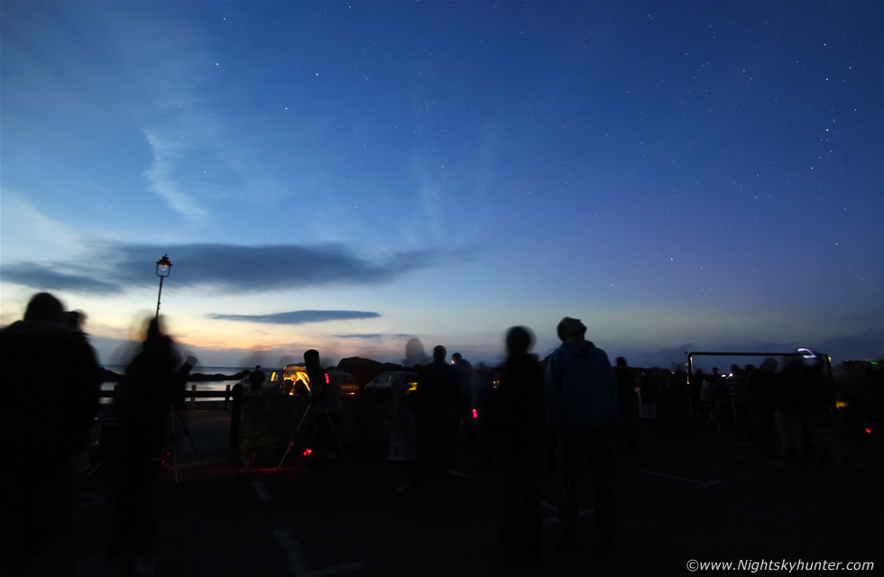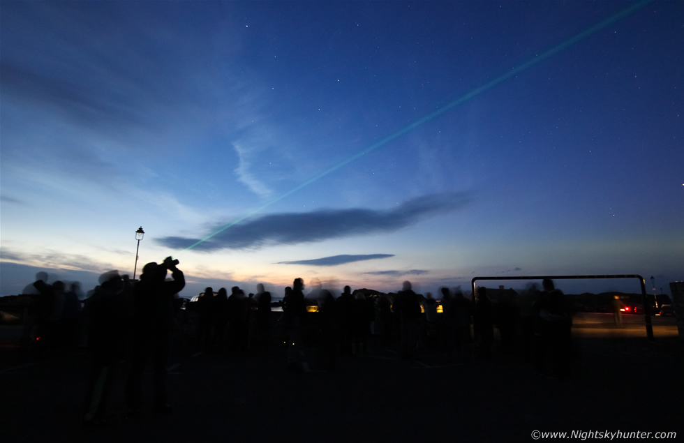 NIAAS ended up getting a great turn out, the harbour at Ballintoy was packed with cars and many people who seemed to have assembled in the growing darkness within the car park facing the sea. I wandered over and mingled with the crowd, it was dark and impossible to make out faces however I recognized a voice beside a telescope at the far corner informing members of the public about the night sky, the voice had to be Neill Patterson, I went over for a closer look and sure enough it was, we shook hands and had a good chat and got caught up on things. NIAAS had obtained permission to get all the annoying harbour lights switched off which was fantastic, the harbour was much darker and very atmospheric, I was enjoying the ambience very much. Even though it was still twilight I was sure that the sky had that suspicious look to it with the naked eye so I took this exposure with the camera set up behind the crowd and sure enough it very clearly picked up an aurora, check out the green band to the lower right, considering how bright the sky was this was a good sign and I was confident there was going to be a good show.