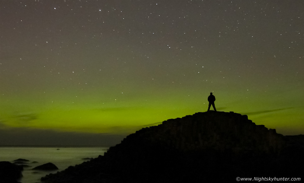 After midnight the aurora began to lower back to the horizon so I decided that I would make my way across the rocks and stand on the top for the finale, however this wasn't as easy as it might seem, the rocks were some distance away and I couldn't use any lights at all to see where I was going otherwise they would show up on the star trail/time lapse on both cameras so I had to make my way across in complete darkness, I can tell you that this place can get extremely dark on a moonless night and the rocks are extremely hazardous - even when dry - it would be very easy to twist an ankle, break a knee cap or leg or even worse, so the going was slow as I carefully placed each boot on every new rock I could make out and with my hands I groped my way across and finally made it to the top, this is one of the images from the time lapse which I cropped in closely, I just had to include it for the memory, the view from the top was amazing and the sea was still glowing green, I should have did another trail from up there however the aurora was fading and I sensed that the Causeway wanted to be left in peace so I made my way back, collected the cameras and headed back to the van.