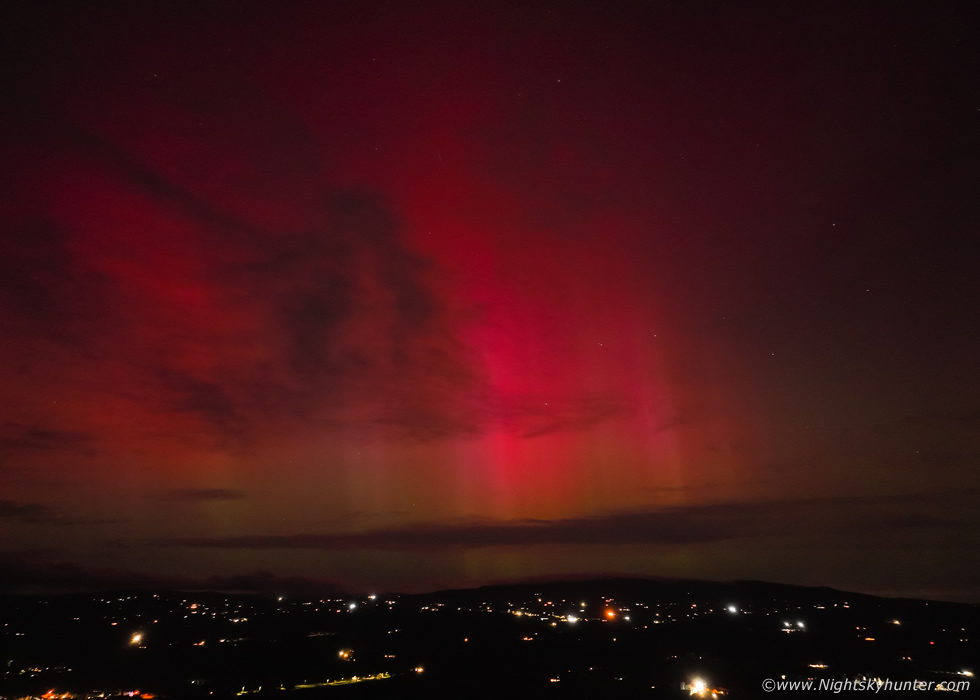 We made our way home just before sunset, then as we crossed the Omagh road I could see a strange glow to the sky in the W/NW, even though it was still twilight I felt sure it was aurora, Roisin could see it too, the sky had that strange glowing milky look to it, I checked the charts and saw an update saying the storm had reached G4 levels!. We literally had just arrived in Cookstown, pulled into the drive way and I opened the car door and looked up, and there was a massive aurora! Huge crimson and pink beams and curtains could easily be seen with the naked eye reaching up to the altitude of Polaris and all over street lights and house lights, it was shocking. I got the drone powered up and flew it to 120m for a look, switched to Pro Mode and began taking exposures. This was 3 sec's at ISO800, it looked like the sky was on fire with pink and red flames, I shot a number of images then landed, I wanted to sort a few things out before I drove out for more images.