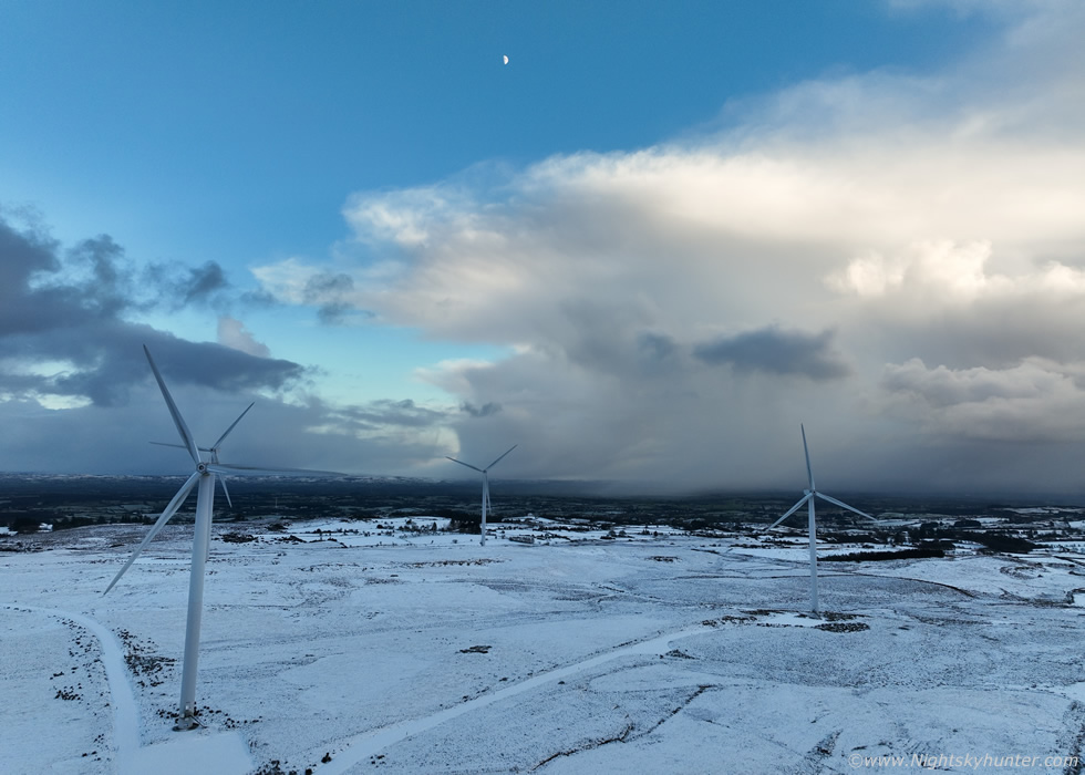 View to the SW over the turbines to a snow shower and the Moon making an appearance. The light was getting low and the temperatures were plummeting, I was struggling to fly the drone, my fingers were numb with the cold, we knew the thermometer would drop to negative numbers soon and this road could be problematic later so we decided to end our shoot and head home. Even though this day had been frustrating regarding light we still enjoyed it and at least I got a couple of cells and snow curtains. However, with several more days of the cold spell remaining and with models showing no more major snow showers I was wondering would this be it?, was my chance of Winter photo opportunities over?, I really wanted something else to take this cold spell to the next level.