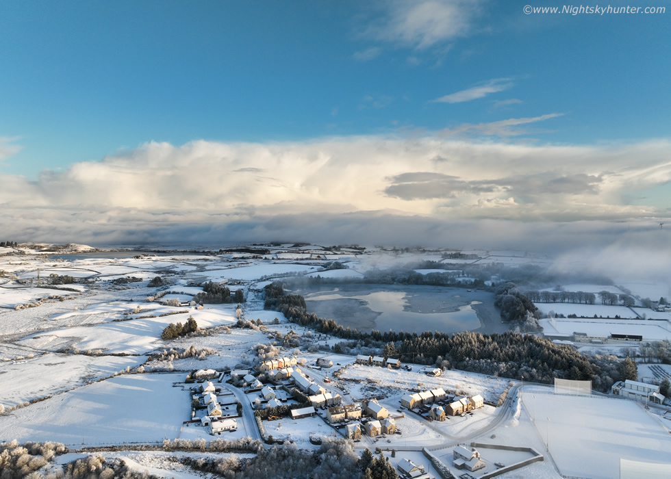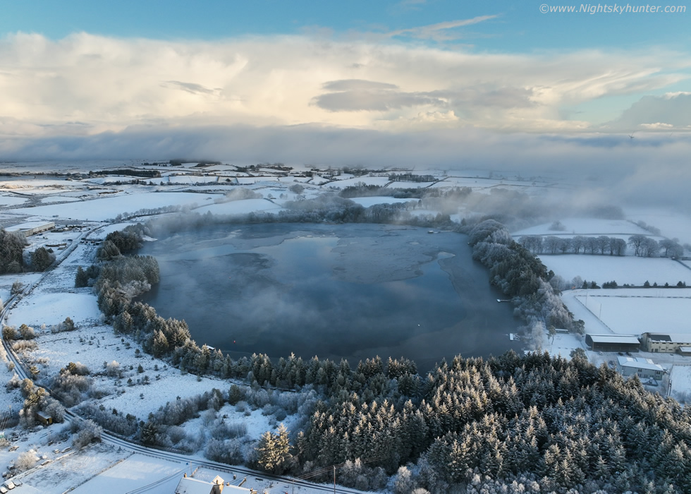 The country road to the lough was stunning, snow in the fields and hoar frost on the everything, some of the best scenes where at road sides where we couldn't stop or in people's gardens so we continued to the lake and walked out through the crunchy snow for an explore. It was one of those amazing Winter mornings when you were thankful for being alive, you know what I mean?, deep snow on the ground, bushes covered in frost, but what shocked us most was that a good portion of the lake was frozen over. The sun popped up behind a bank of freezing fog and we got our drones in the air. Lough Macrory at first light with scattered wisps of freezing fog and a big snow shower in the distance to the N.