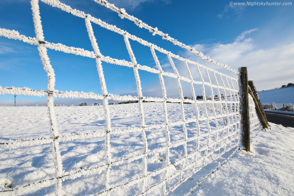 I woke up at 07.00 to ice everywhere, I packed the van, had a warm breakfast, cleared the windscreen then Rhua and I hit the road. It was morning twilight and the sun would not be rising for more than an hour, this was intentional as we needed to be on location at first light during the coldest part of the morning, this when the best magic usually happens in Winter, you really do have to be an early riser to get the good stuff. I couldn't believe the transformation once I left Cookstown, the Omagh road was beautiful, snow everywhere, a true Winter wonderland, it was stunning in all directions, I knew then we were going to score. I was making very good progress, the stretch of road between Beaghmore and the Seven Sisters Lakes was remarkable. Snow as far as the eye could see in all directions over a vast open landscape and hoar frost covering everything!, jack pot, I couldn't believe our luck.