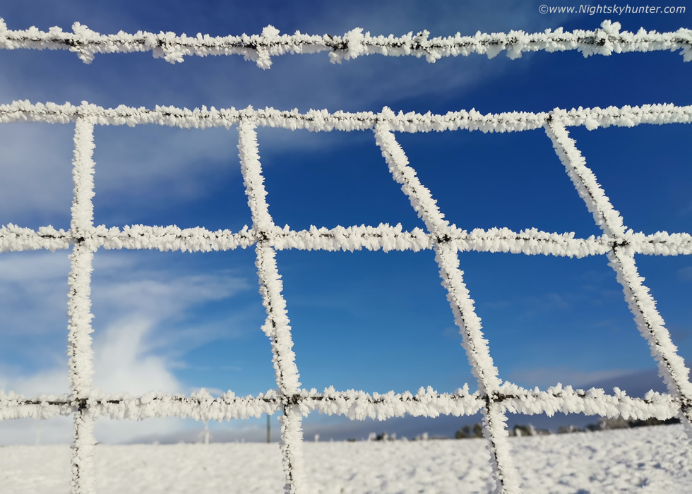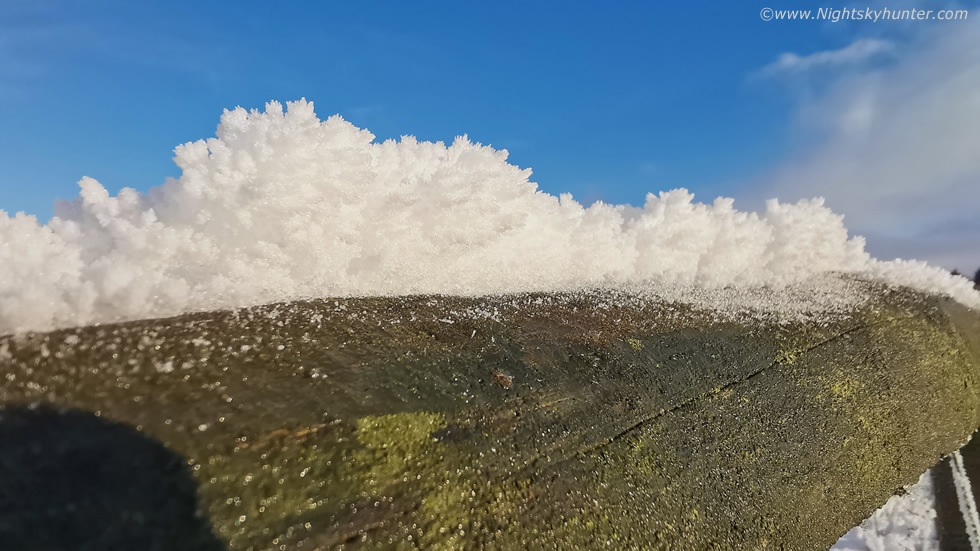 Hoar frost forms once frozen water droplets make contact with any surface, there must have been freezing fog here earlier, this combined with -7c temps and dead calm air was the perfect atmospheric factory for this special kind of frost. The process actually goes from the liquid phase to a solid phase without going through the gas transition, this is called sublimation, similar to what happens on the nucleus of a comet. Those ice crystals stack on top of one another into accumulations, hoar frost can look like blades, needles or rice, it can have a semi clear or white look depending upon how thick the covering is, many often mistake it for snow.