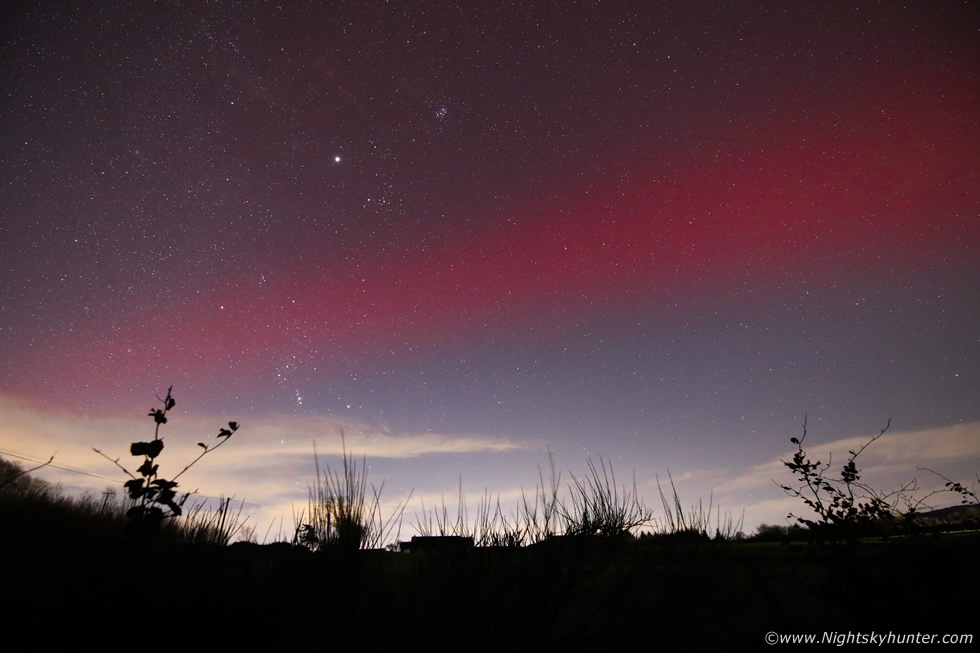 I drove to Lough Fea and met Colleen Webb who was also out aurora hunting. The sky was dark and clear, the ground sparkled below us in the frost and the stars were vivid and beautiful. We could see the faint glow of the aurora 15 degrees high to the N as a bland glow with a hint of green, it was stirring but we felt it wasn't going to go into outburst so we turned our cameras to the W/SW and took an exposure, the camera revealed a stunning red SARS arc, it was actually really impressive showing on camera even after a few seconds of exposure time. It extended from the S, through the SW then down into the W sky in one massive ghostly band. The SARS arc passed straight through Orion and was framed by the Hyades cluster, Jupiter and Pleiades cluster above. Colleen took an image further to the W and called me over with excitement, the arc was even more impressive in that direction so I turned the camera around and took an exposure in that direction.