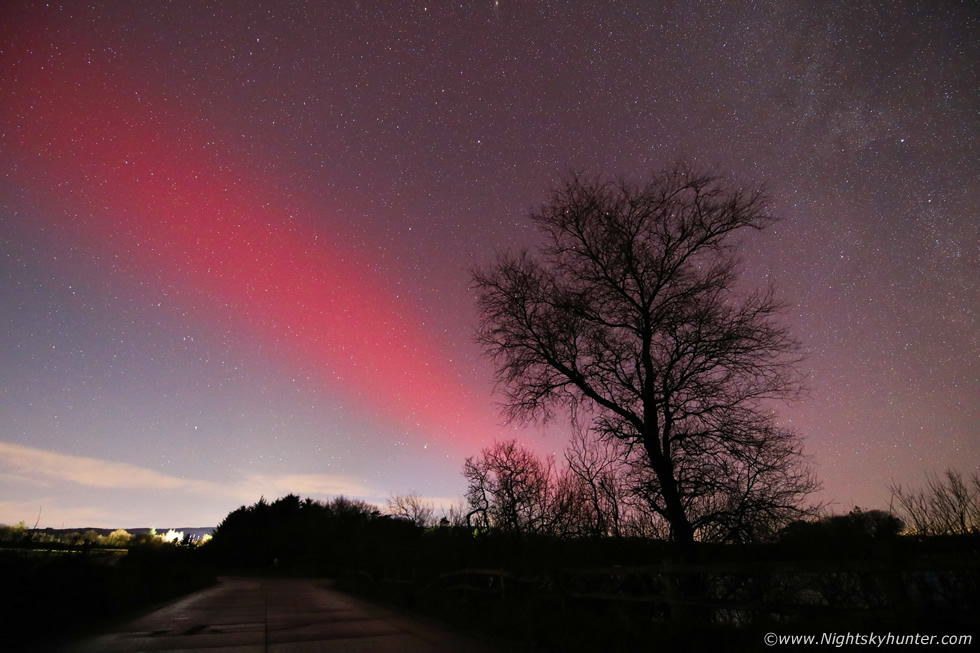 I can honestly say never in my life had I seen a bright naked eye aurora in January before, especially on New Year's Day, and a waning G4 geomagnetic storm at that, this was a completely new experience, what a thrilling way to start a new year, this proves just how potent and action packed solar maximum has been and to think we still have another year or two of this kind of activity to come. I had a feeling this was going to be a long night and it was already freezing outside, so I packed some food, a flask and changed into layers of clothes, but before I went out I checked the charts and the aurora had subsided, it looked like the storm was over, however not wanting to be caught off guard I planned to go back out anyway for a watch as sometimes these big storms can flare up again. I then got a message from Paul Martin who was out watching from Co. Fermanagh, he was reporting a massive SARS arc on camera, that sounded good to me, even if the aurora was gone the SARS arc would be worth shooting.