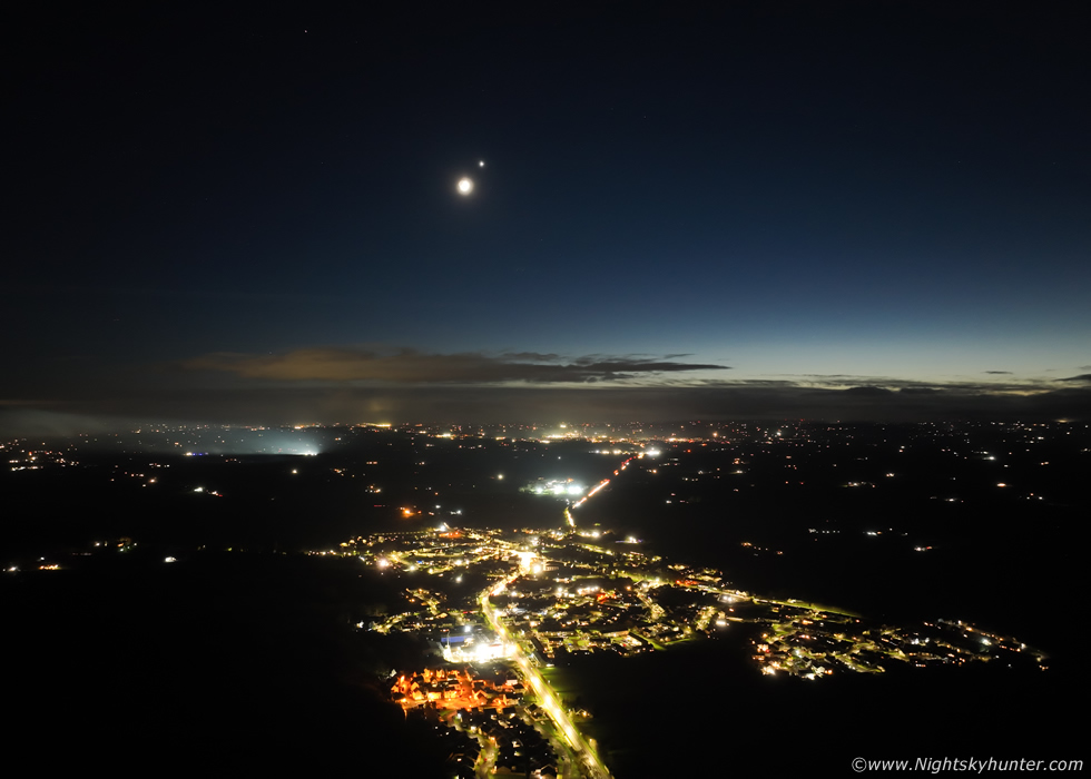 As the sky darkened more Venus and the Moon seemed to increase in brightness, the Moon's earthshine was also visible adding to the beauty of the scene and not far away to the upper left was planet Saturn. I got the drone up again and this time took several exposures of the scene over the town lights of Moneymore with the lingering twilight glow still in the sky. By now my hands were freezing, the frost was settling in and I could barley feel my fingers from using the drone controller so I ended the session and went back home content where I had a hot whiskey to warm me up.