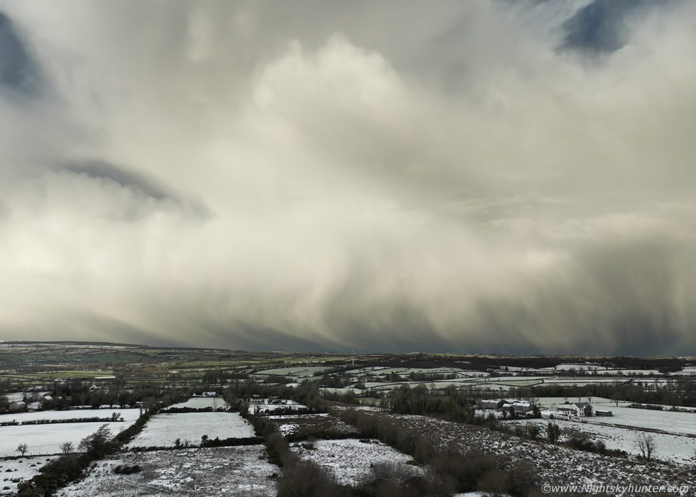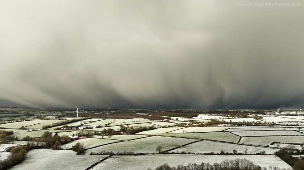 Our view looked across flat fields and off in the distance was Lough Foyle and Co.Donegal, it was a good spot, we did have some breaks in the cloud but those kept filling in again and regular snow showers passed over us. We spotted these nice snow curtains fast approaching from the Foyle area and for the first time this day I got the drone in the air. These curtains of snow were greatly curved due to increasing winds aloft with their parent tower/anvil leaning for miles downrange once fully developed, as a result we were always covered by anvil cloud or wind driven snow and soft hail well ahead of the main cores, however this was one of the few times we got a proper view.