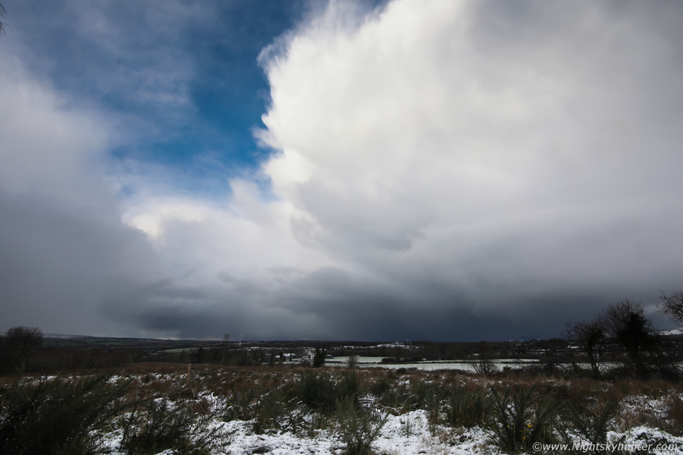 Two big Winter Cbs one behind the other approaching from Co. Donegal on the same trek as the previous cell. Nigel and I were out shooting it as soon as it came into view. It's difficult to do justice here because in real life this thing was massive, this wass 15mm on full frame and it wasn't even near us yet. It had a very dark core and I honestly was expecting thundersnow at any moment, look at the base of the cell behind it, very interesting structure. As our main Cb neared it's tower grew so tall that the wind aloft blew it over us for miles ahead of the core, the big white anvil was huge and around its leading edge where solid chunks of mammatus, I said to Nigel ''why isn't this producing thunder?'', we didn't know, it looked the part and was tall enough. At one stage we just used our mobile phones to film the anvil then it got so large we couldn't fit it into any camera FOV. Hail then snow ensued then it passed over the Sperrins behind us with red cores on radar. We had an hour and a half until sunset so we decided to change location, we began the drive to the wind turbine farm above Swatragh.