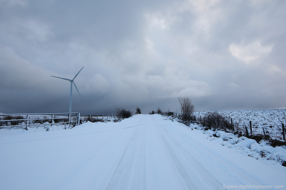 On the drive up the snow at low levels was thawing and it looked rubbish, Nigel and I both came close to turning around and going home, however we pressed on anyway, we where here so may as well give this day one last go. Once we began to climb the hill and gain elevation above Swatragh the road was transformed into a Winter wonderland, snow with ice below, a few times the van spun but I managed to keep it on the road then we came to a stop near the turbines. It was a completely different world up here, we had proper snow, 7cm where we had parked and it was good compacted snow too. This was the view along the road looking S. Rhua played around in the snow for a while, I had a warm brew then got the drone up, but yet again same issue all day, the sky was overcast with no light, we could see the tops of a nice cell to the NW however the cloud hid much of it from us, we knew we were not going to get any light at all for golden hour, so we just enjoyed the snow visually, we both agreed it felt great to be out in it.