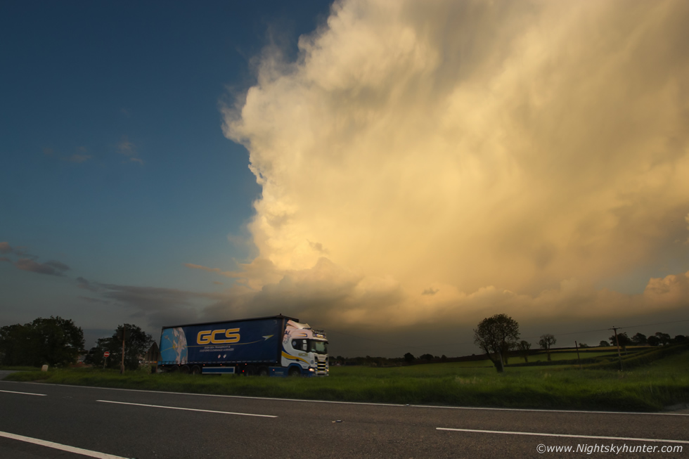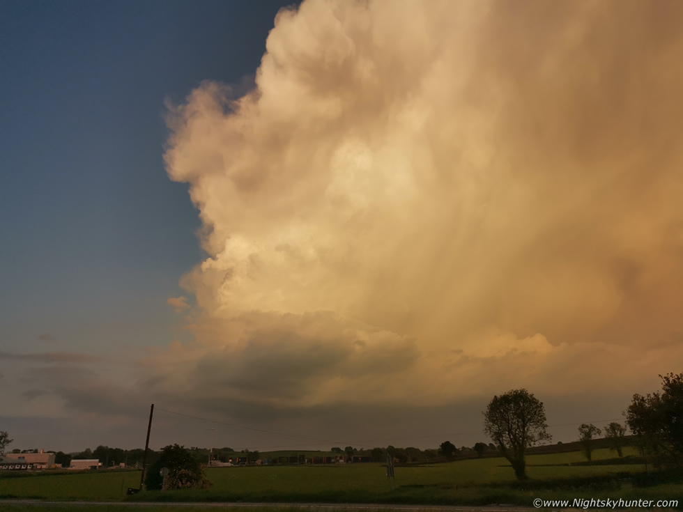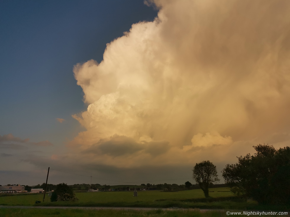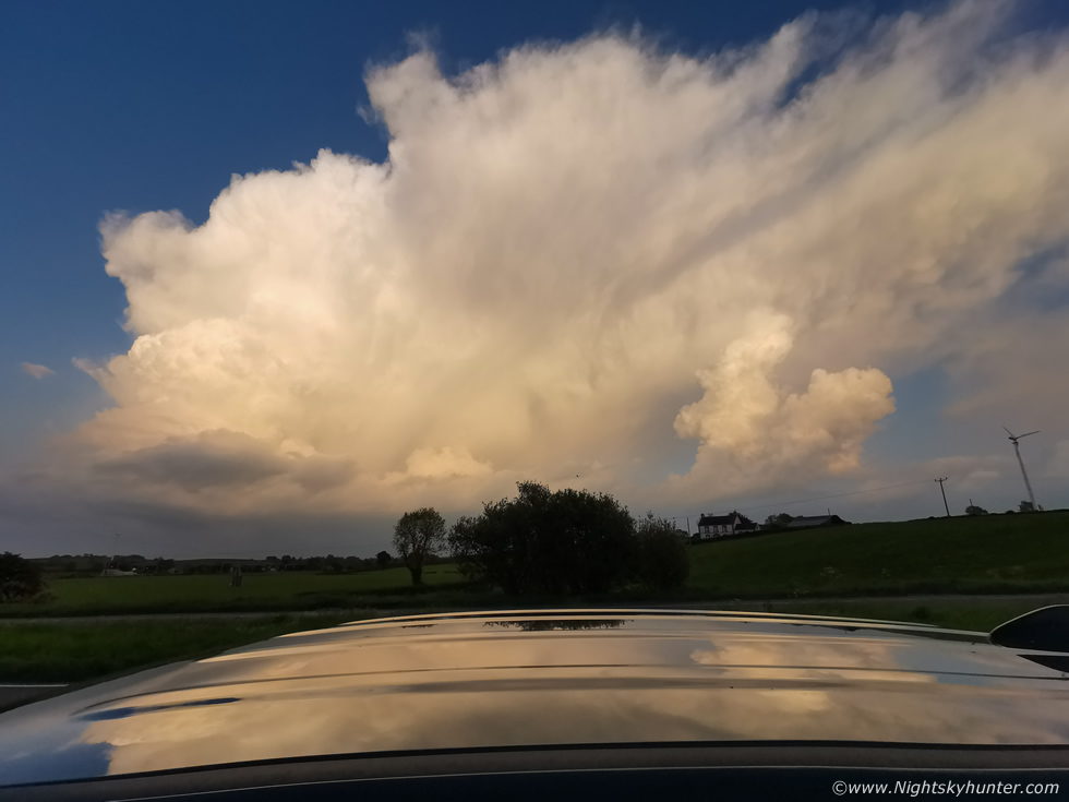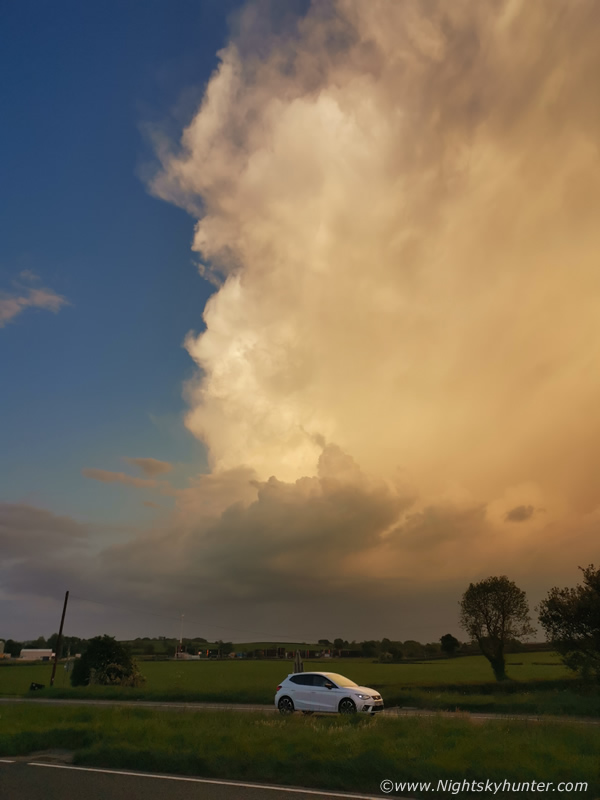 We were driving along the carriageway between Cookstown and Moneymore when we enter a clearing and seen a big cell which seemingly had appeared from nowhere a few miles away to the SE, we pulled over onto the shoulder and got out for images. I was mostly using my mobile phone camera for these unless otherwise stated. For me this was the treat of the day, entire cell lit into a surreal orange-yellow-gold glow, I looked behind me and the sun was only a few degrees from setting in a clear sky. The main updraught was gorgeous with crisp knuckles with cauliflower tops expanding upwards to a big height, this was the best updraught I had seen all day. It was already producing precip and the anvil was forming and beginning to propagate downwind. Then thunder, it was now a storm!