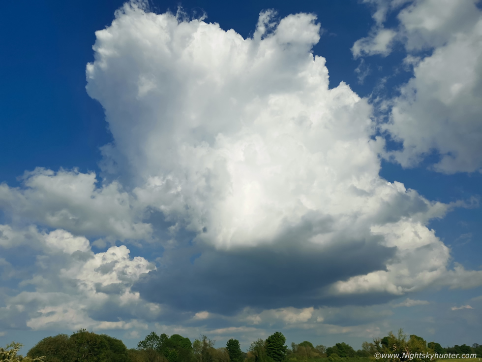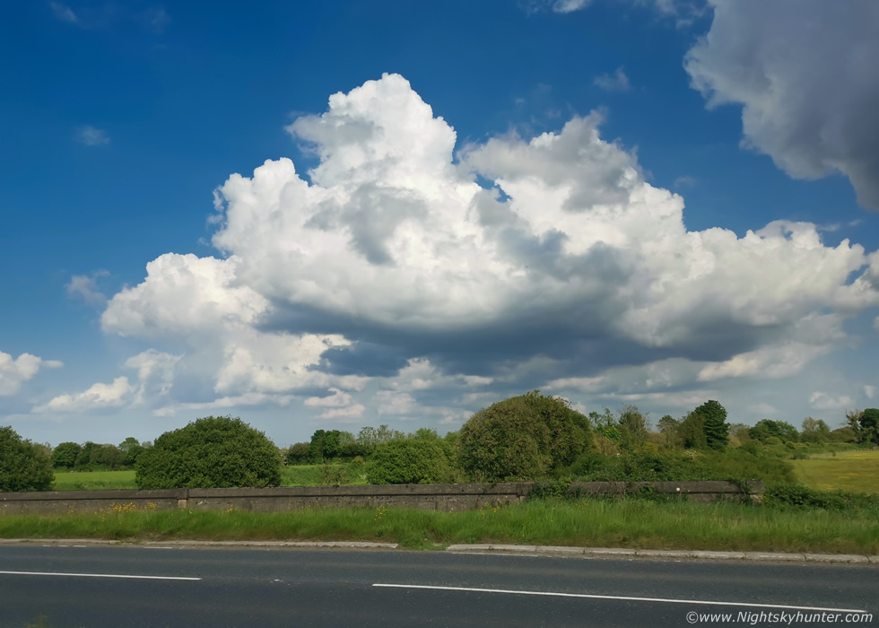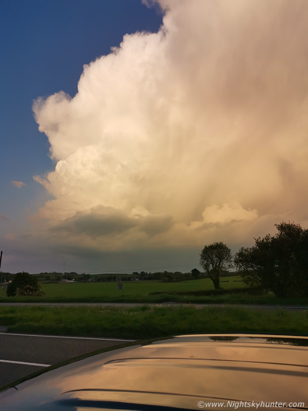 The towers got taller and began to spread out downwind to form the early stages of a weak anvil, these were actually trying. Half an hour later I lost sight of them to the S when I got another call from John Fagan, he had another thunderstorm over Dungannon, it had to have been these very updraughts which did it, so those towers were a developing storm, that was cool. At this stage I really thought the day was over, Roisin was nearly ready to go, it was well after 21.00, before leaving I noticed one more tower to the SE in the warm evening light, it likely was too late now for it to do anything, so Roisin and I hit the road.