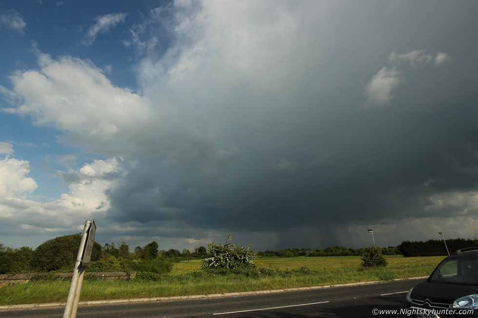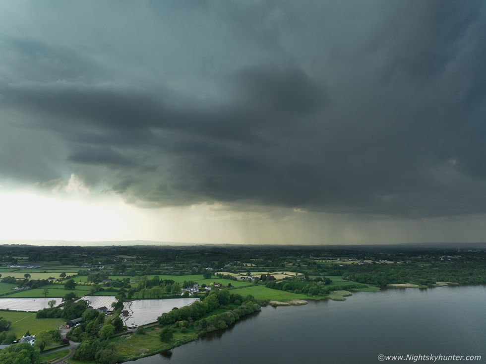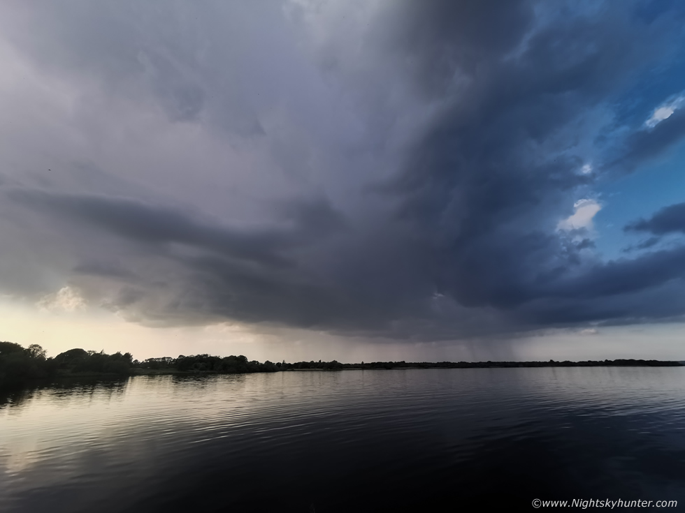 More thunder rumbled over the vets, Rhua got sorted, the roads were all flooded and Roisin drove me back to the van at the Moyola. This was the back end of the same storm, not much to look at but hail was falling under the base. Roisin was going to take Rhua home so I could go chasing for the rest of the evening, I knew Nigel and Colleen Webb would be targeting the expected lough cells so on an instinct I made my way to Ballyronan to see if they were there. As I approached Ballyronan three things were apparent. First there was another cell over the N end of the lough, another more impressive cluster of what looked like storms to me where over the S of the lough and inland, and thirdly the trees were covered in spectacular displays of flies with tall dark swarms and fly 'nadoes' dancing over the tree tops, it was really stunning. On a normal day I would be shooting those but the storms were a priority.